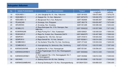20 KEBUMEN II Jl. Kejayan No. 14, Kec. Kebumen 0287-3873476 109.692.276 -7.694.417