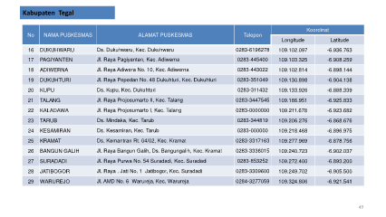 16 DUKUHWARU Ds. Dukuhwaru, Kec. Dukuhwaru 0283-6196278 109.102.097 -6.936.763