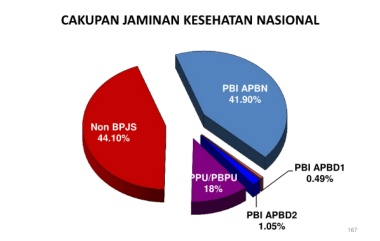 CAKUPAN JAMINAN KESEHATAN NASIONAL PBI APBN 41.90% Non BPJS 44.10% PBI APBD1 PPU/PBPU 0.49% 18% PBI APBD2 1.05% 167