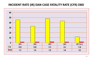 INCIDENT RATE (IR) DAN CASE FATALITY RATE (CFR) DBD 60 50 40 30 20 10 0 2013 2014 2015 2016 2017 (Tw 1) IR 45,52 32,95 47,9 43,4 11,48 CFR 1,21 1,44 1,56 1,46 1,69 44