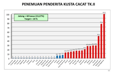 PENEMUAN PENDERITA KUSTA CACAT TK.II 100,0 100 Jateng = 60 kasus (13,27%) 90 Target < 10 % 77,8 80 70 60 50,0 50 40 27,3 27,3 28,6 28,6 30 20,0 20 12,5 13,3 14,6 15,4 16,7 16,7 17,4 10 5,6 5,9 7,1 0 0 0 0 0 0 0 0 0 0 0 0 0 0 0 0 0 65