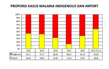 PROPORSI KASUS MALARIA INDIGENOUS DAN IMPORT 100% 90% 80% 70% 60% 50% 40% 30% 20% 10% 0% 2012 2013 2014 2015 2016 2017 (Tw 1) Indigenous 55,17 57,17 68,20 86,61 62,19 42,00 Import 44,83 42,83 31,80 13,39 37,81 58,00 71