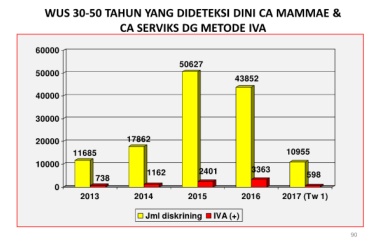 WUS 30-50 TAHUN YANG DIDETEKSI DINI CA MAMMAE & CA SERVIKS DG METODE IVA 60000 50627 50000 43852 40000 30000 20000 17862 11685 10955 10000 1162 2401 3363 598 738 0 2013 2014 2015 2016 2017 (Tw 1) Jml diskrining IVA (+) 90