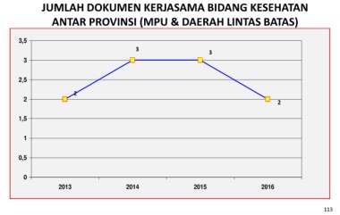 JUMLAH DOKUMEN KERJASAMA BIDANG KESEHATAN ANTAR PROVINSI (MPU & DAERAH LINTAS BATAS) 3,5 3 3 3 2,5 2 2 2 1,5 1 0,5 0 2013 2014 2015 2016 113
