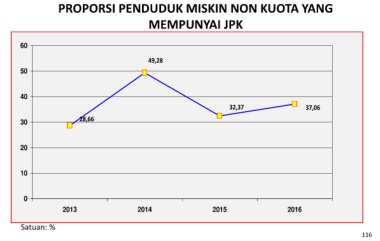 PROPORSI PENDUDUK MISKIN NON KUOTA YANG MEMPUNYAI JPK 60 49,28 50 40 32,37 37,06 30 28,66 20 10 0 2013 2014 2015 2016 Satuan: % 116