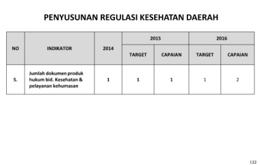 PENYUSUNAN REGULASI KESEHATAN DAERAH 2015 2016 NO INDIKATOR 2014 TARGET CAPAIAN TARGET CAPAIAN Jumlah dokumen produk 5. hukum bid. Kesehatan & 1 1 1 1 2 pelayanan kehumasan 122